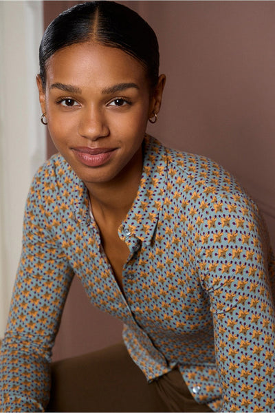 Camisa de manga larga confeccionada en viscosa suave y elástica, con un encantador micro estampado de aire retro. Su corte clásico con cuello camisero la convierte en una prenda versátil, cómoda y con mucho estilo, ideal para el día a día. Biodegradable y organico.