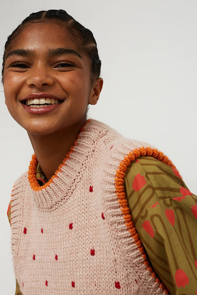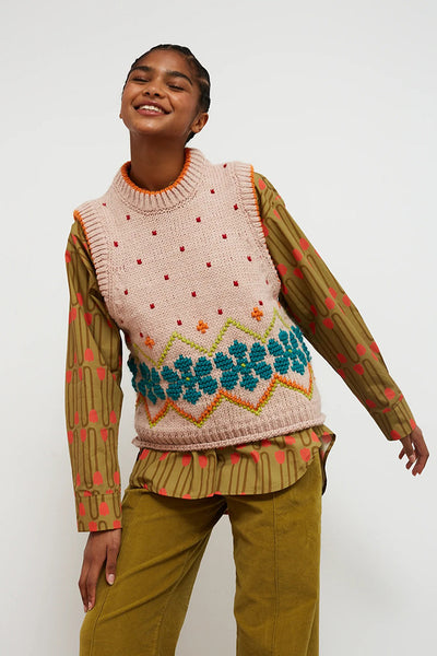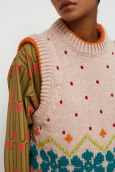 Chaleco de punto color base nude. Textura con dibujo de flores naranja, puntos rojos, copos de nieve en turquesa, y zig-zag en verde y naranja, a contraste. Acabado naranja a contraste en cuello redondo y en sisas. Perfecto para terminar tu outfit y llevar encima de camisas o vestidos.