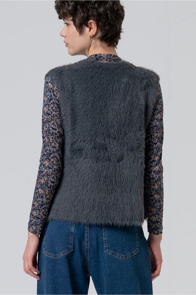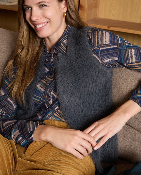 Chaleco tricot sin cierre con acabado efecto pelo, ideal para superponer sobre camisas o jerséis finos. Tejido suave y ligero con textura gustosa al tacto. Un extra de estilo para looks de entretiempo o capas otoñales.