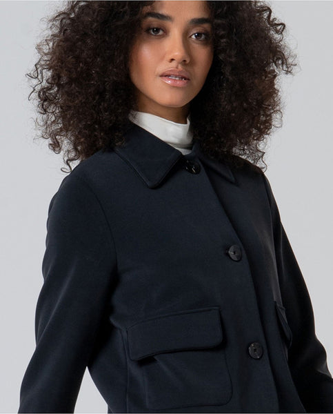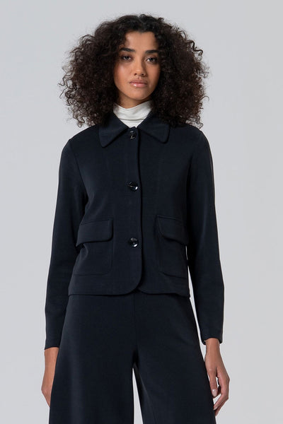 Chaqueta corta confeccionada en modal grueso, un tejido extra elástico y suave. Con cuello clásico y bolsillos delanteros, combina estructura y confort en una prenda versátil que se adapta con estilo al ritmo diario.