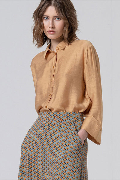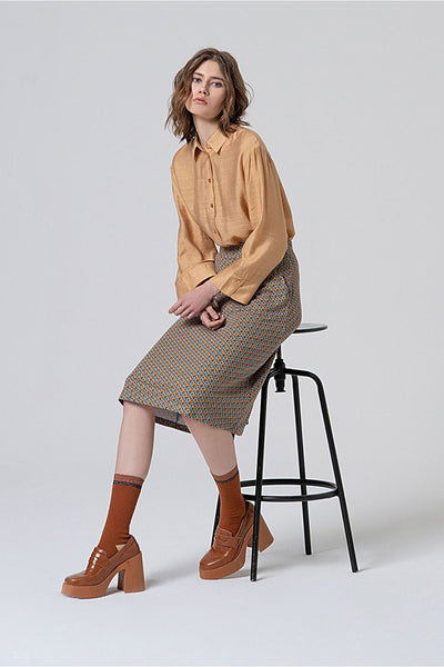 Falda a la rodilla con silueta evasé, sin cierres para una mayor comodidad. Está confeccionada en una viscosa suave y elástica con un pequeño estampado geométrico de aire retro que la convierte en una prenda muy femenina. Biodegradable y organico.