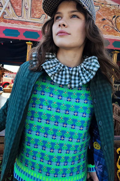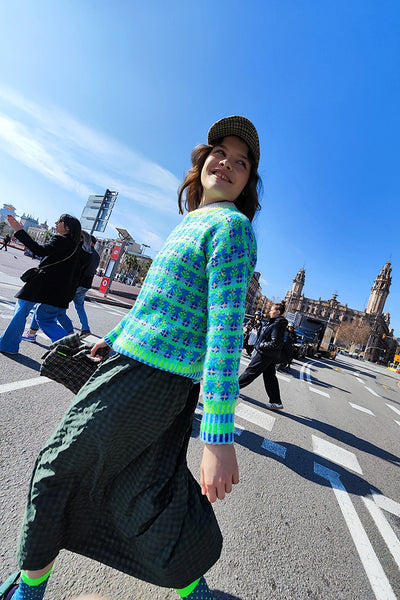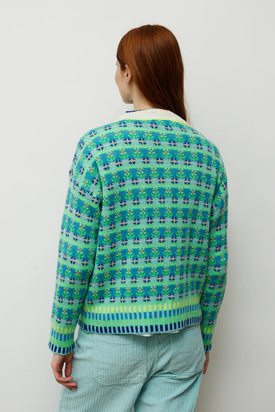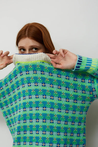 Jersey de punto con estampado de flores en franjas horizontales en tonos azules, verde y naranja. Cuello redondo amplio en canalé con contraste en amarillo neón, blanco y acabado en azul. Puños y bajo acanalados multicolor con franjas verticales en amarillo, azul claro, verde y azul oscuro. Corte recto y cómodo, repelente del agua.