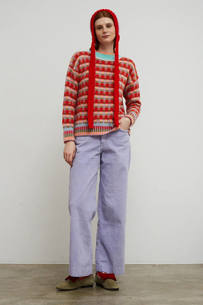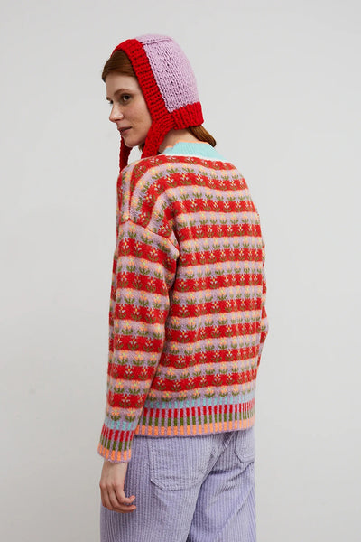 Jersey de punto con estampado de flores en franjas horizontales en tonos azules, verde y naranja. Cuello redondo amplio en canalé con contraste en amarillo neón, blanco y acabado en azul. Puños y bajo acanalados multicolor con franjas verticales en amarillo, azul claro, verde y azul oscuro. Corte recto y cómodo, repelente del agua.
