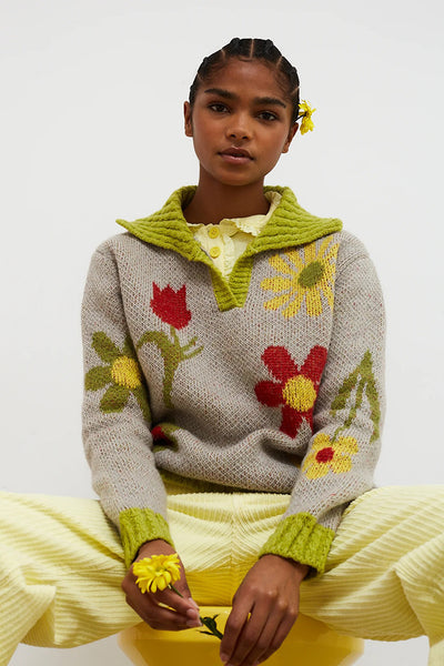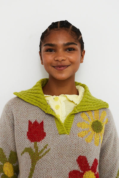 Jersey gris con jacquard de maxi flores en tonos amarillo, verde y rojo. Cuello marinero, corte recto y manga larga. Detalle de acabados en punto trenzado en puños, bajo y cuello. Tejido gustoso y esponjoso en mezcla de lana.