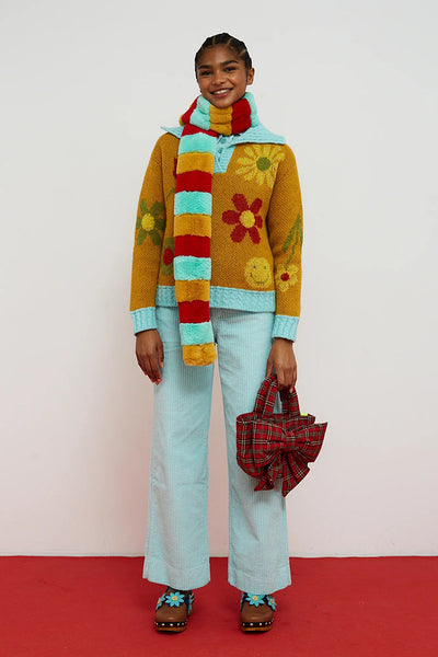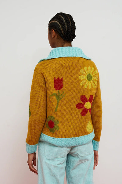 Jersey ocre con jacquard de maxi flores en tonos amarillo, verde y rojo. Cuello marinero, corte recto y manga larga. Acabados en punto trenzado en puños, bajo y cuello en color agua. Tejido gustoso y esponjoso en mezcla de lana.