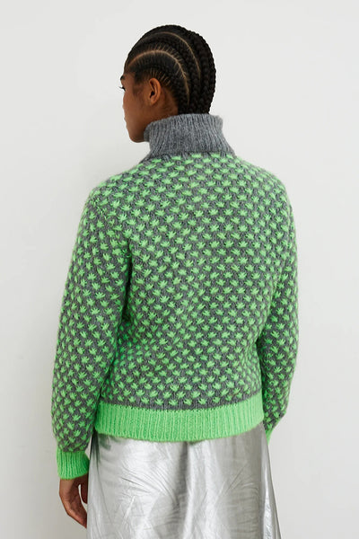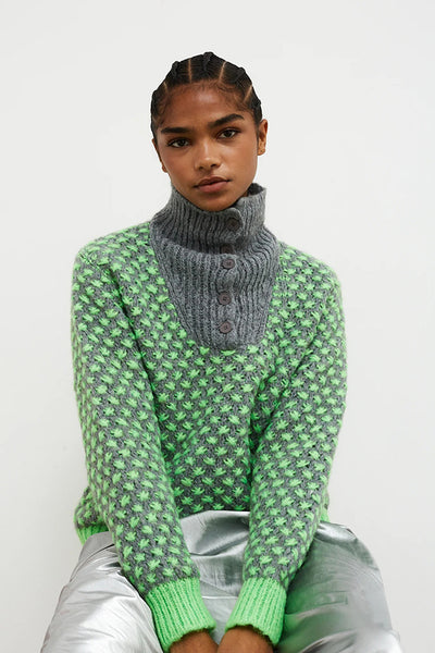 Jersey de corte recto con trama estrellada en color gris y verde. Puños y bajo rematados en canalé ancho de color verde que aporta estructura y contraste al diseño. Detalle especial de cuello chimenea de canalé en punto grueso gris con cierre de botones frontal, ideal para aportar un toque versátil y abrigado al look.