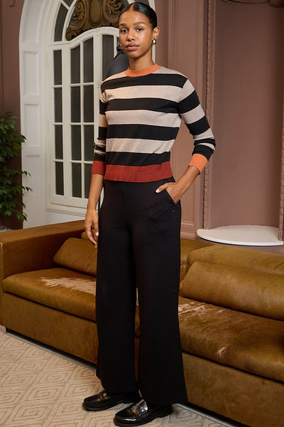 Jersey de punto con cuello redondo y rayas anchas multicolor. Un diseño fresco y lleno de energía, ideal para mujeres que buscan prendas cómodas, con calidad y un toque divertido. Su suavidad y elasticidad garantizan confort y estilo.