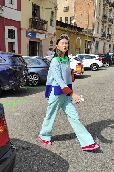 Jersey de corte recto oversize de base color azul. Manga caída y acabado en bajo asimétrico color azul marino con corte lateral. Presenta un cuello XL tipo camisa en color verde flúor con cierre de botón frontal. Los puños amplios rematados en color marrón aportan un toque original y vibrante.