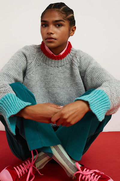 Jersey color gris, de corte recto con manga ranglán, confeccionado en punto grueso. Presenta detalle rojo en el cuello y en el bajo, que aportan un toque de contraste vibrante. Los puños están rematados en tono azul y una apertura lateral para dar movimiento y comodidad, así como en la parte trasera del cuello. El cuerpo incluye una textura en forma de zigzag que le da un acabado artesanal y distintivo.