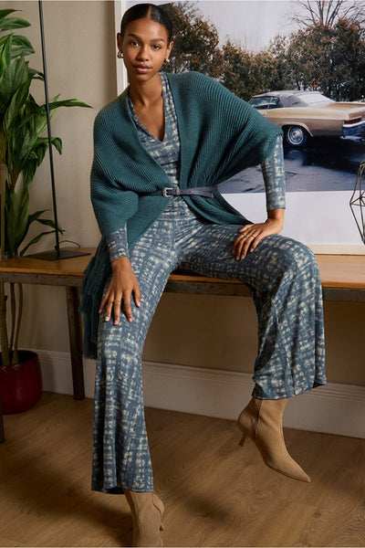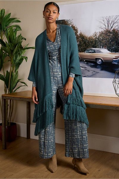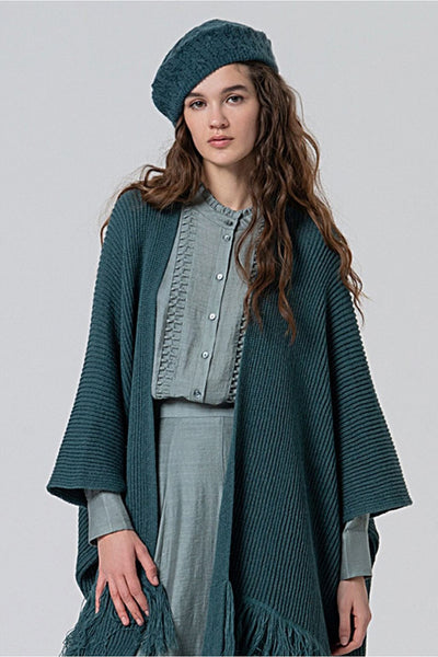 Poncho de tricot canalé con mangas integradas y un diseño de inspiración folk. Destaca por sus dos tiras decorativas con maxi flecos que aportan movimiento y personalidad.