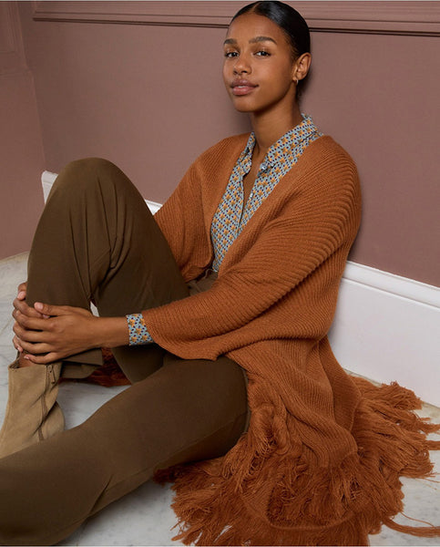 Poncho de tricot canalé con mangas integradas y un diseño de inspiración folk. Destaca por sus dos tiras decorativas con maxi flecos que aportan movimiento y personalidad.