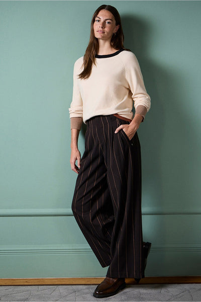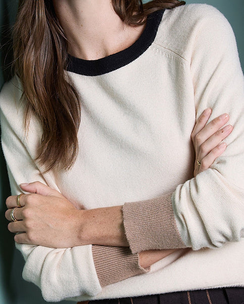 Jersey de punto con cuello redondo y detalles bicolor en cuello, puños y bajo. De corte recto y manga larga, es una prenda versátil y ligera, ideal para el día a día con un toque distintivo.