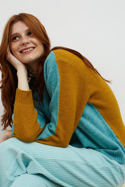 Jersey bicolor. Parte frontal en color agua y parte trasera color mostaza. Cuello redondo chimenea. Corte recto y cómodo, rematado en canalé en puños y bajo. Perfecto como básico con un giro inesperado. Original y colorido. Un solo giro puede cambiar tu outfit.