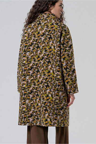 Abrigo corte recto con cuello mao, bolsillos invisibles, cierre central. Estampado animal print.