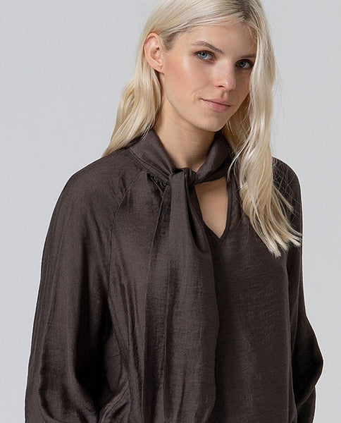 Blusa fluida de viscosa con cuello lazada y puños fruncidos. Caída ligera y elegante que la convierte en una prenda ideal para looks cómodos con un toque refinado. Aporta movimiento y estilo con un tejido suave al tacto. Biodegradable.