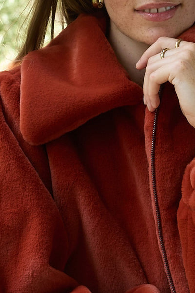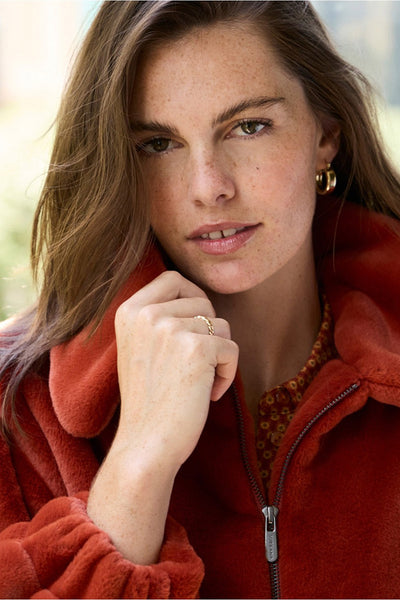 Chaqueta tipo bomber, confeccionada en tejido peluche extra suave, ofrece una silueta desenfadada y actual. Su diseño sin forro potencia la ligereza y la comodidad, mientras que el cuello amplio, las mangas abullonadas y el bajo elástico aportan un aire moderno y relajado.