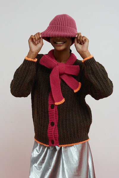 Cárdigan de punto con textura en color marrón. Cuello lazado que aporta un toque divertido y único, en color rosa, y solapa de botones también en rosa a contraste. Presenta botonadura frontal y puños y bajo rematados con canalé elástico en acabado color neón. Ideal para superponer y dar color a los looks.