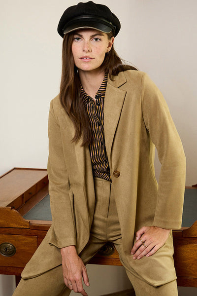 Levita elástica amplia sin forro y cierre con un botón. Confeccionada en un tejido técnico de poliéster con acabado aterciopelado y elástico. Para dar un aire setentero a tus looks.