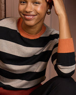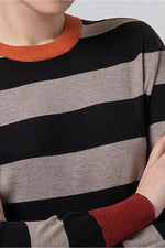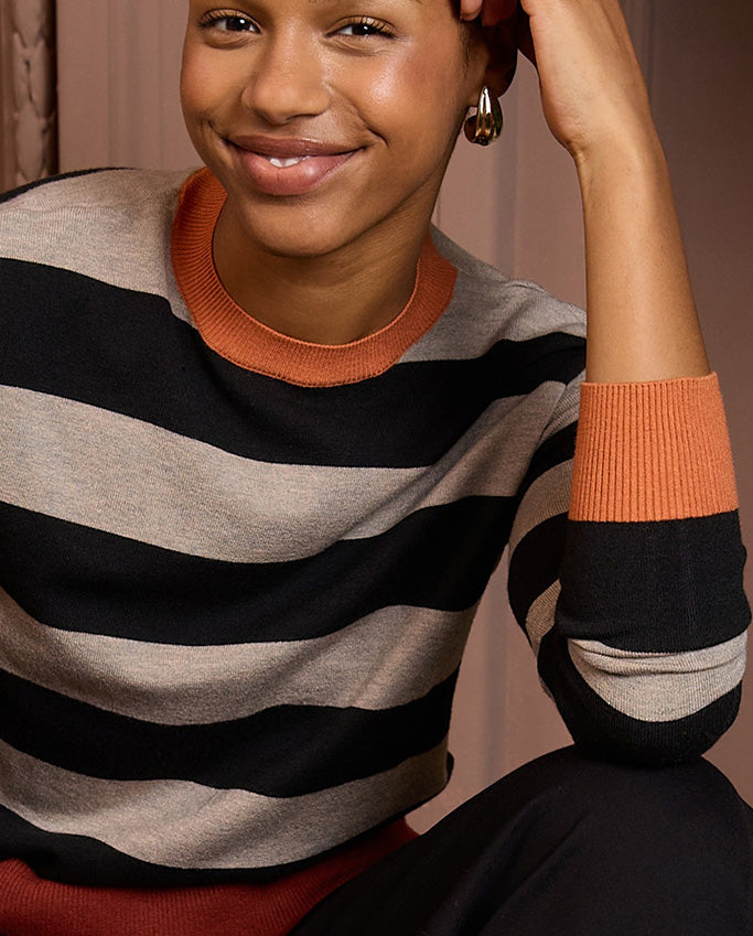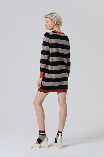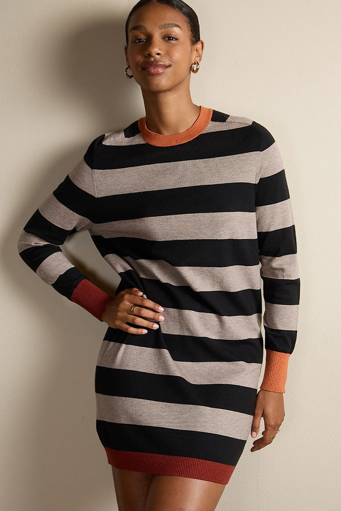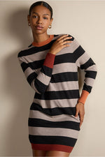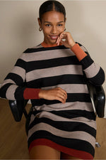 Vestido de punto a rayas de estilo moderno, con corte recto y manga larga. Su tejido suave y elástico lo hace increíblemente cómodo y favorecedor. El diseño a rayas bicolor con bloques en contraste le da un aire actual. Este vestido será tu favorito.